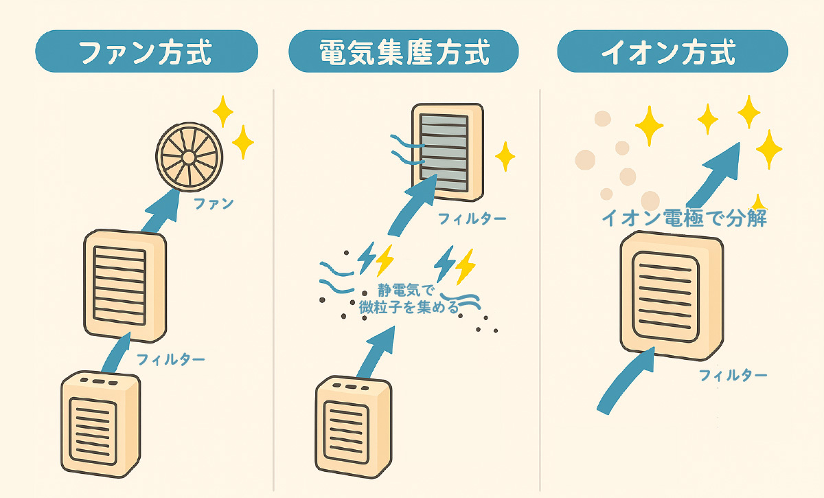 ただし、構造上わずかなオゾン臭を発生する機種もあるため、ニオイに敏感な場合は確認が必要です。また、内部に大きな電気集じん部が内蔵されていることから、ファン式と比べるとスペースを取りやすい点もデメリットといえます。