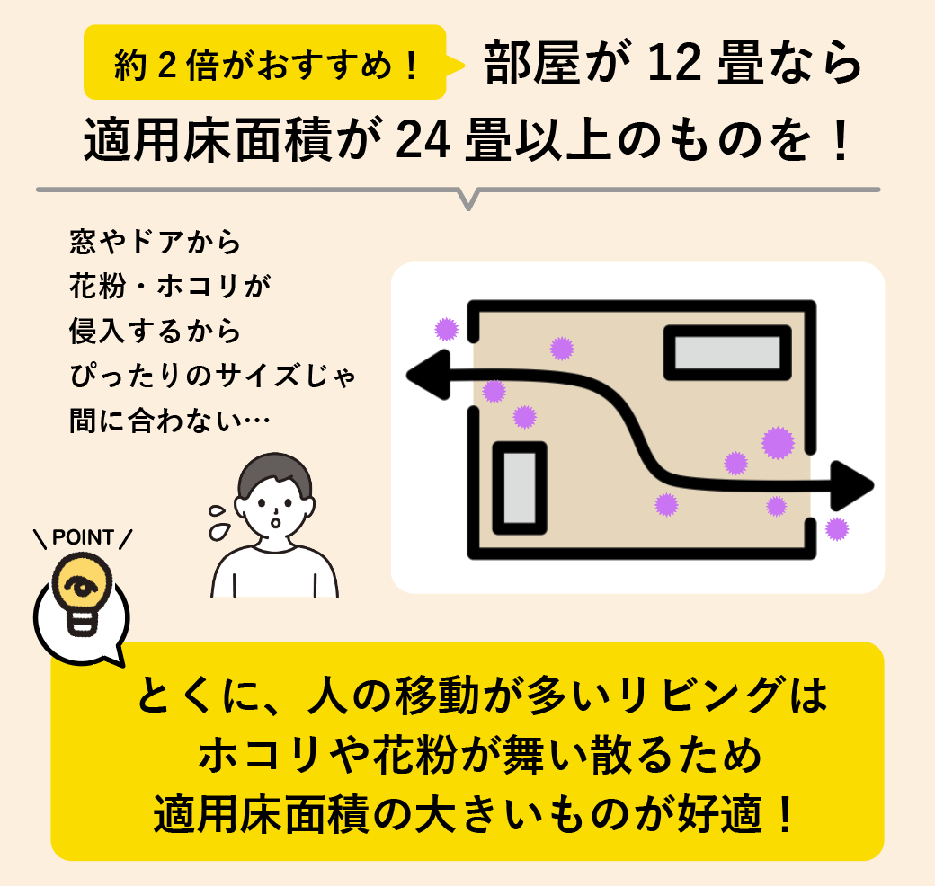 空気清浄機を選ぶ際は、対応する部屋の広さ(適用床面積)も重要です。実際の部屋サイズよりも約2倍の適用床面積を持つ機種を選ぶとあんしんでしょう。